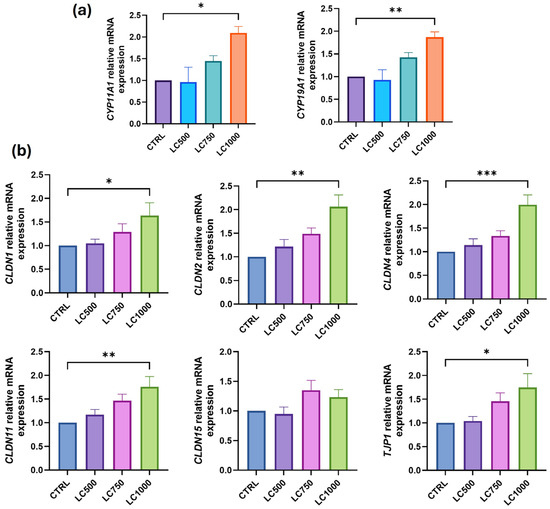 THP-1 monocytes were exposed to varying concentrations of L-cysteine, with the highest concentration (1000 µM) resulting in a significant increase in the expression of CYP11A1 (p = 0.03) and CYP19A1 (p < 0.01) (Figure 2a). Additionally, the expression of BTB genes, CLDN1 (p = 0.04), CLDN2 (p < 0.01), CLDN4 (p < 0.01), CLDN11 (p < 0.01), and TJP1 (p = 0.03) was significantly upregulated after treatment with L-cysteine (1000 µM). However, there was no notable change in the gene expression of CLDN15 (Figure 2b) and lower concentrations of L-cysteine (500 µM and 750 µM) did not impact the gene expression profile.