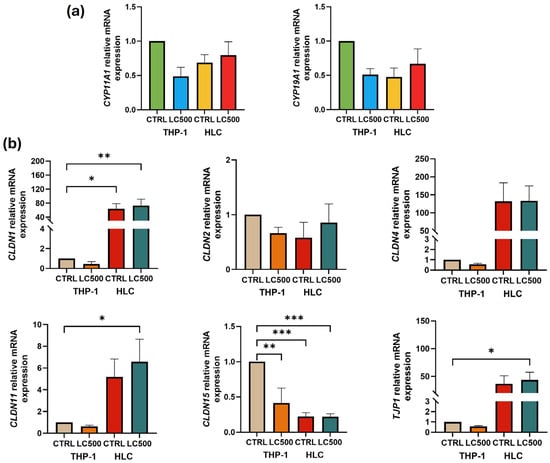 Gene expression levels were compared between Leydig cells and THP-1 monocytes, revealing higher expression of BTB genes CLDN1 (p < 0.01), CLDN11 (p = 0.03), and TJP1 (p = 0.04) in Leydig cells compared to THP-1 monocytes (Figure 3b). No significant difference was observed in the expression of testosterone-regulatory genes between Leydig cells and THP-1 monocytes (Figure 3a).