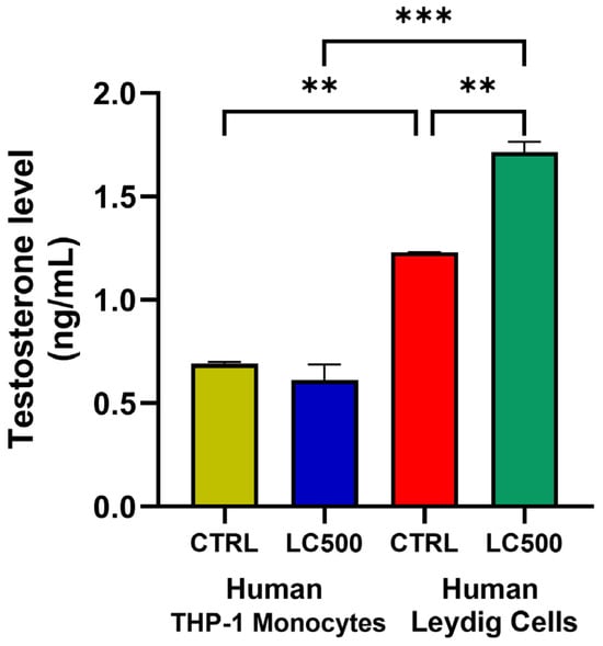 After treatment, the cell supernatant was collected in an Eppendorf tube and preserved at −80 °C. The testosterone levels in the human Leydig cells and THP-1 monocytes were assessed using a commercially available ELISA kit (R&D Systems, MN, USA). First, 100 µL of cell culture supernatant was used for the assay. All necessary controls and standards as outlined by the manufacturer’s instructions were implemented. The absorbance was read at 450 nm. Each sample was analyzed in duplicate simultaneously, and the concentration was determined using a standard curve along with suitable blanks.