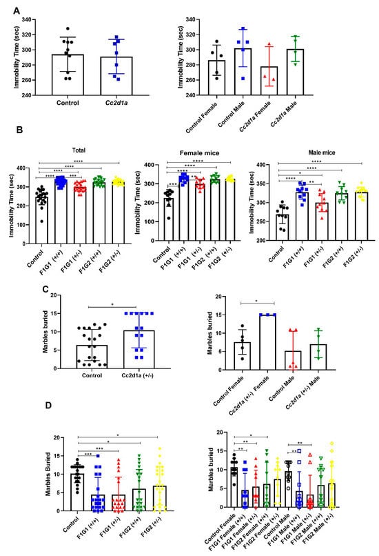 Differences were found between in offspring groups by gender (Figure 1). Immobility times were longer in Cc2d1a +/− offsprings and therefore differed when the control group and the two Cc2d1a groups (G1 and G2) were compared (Figure 1). Immobility time also increased in progenies G1 and G2 +/+ and +/− genotypes compared to the progenies from control.