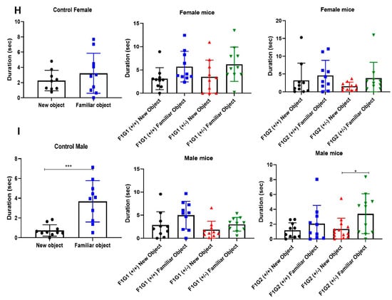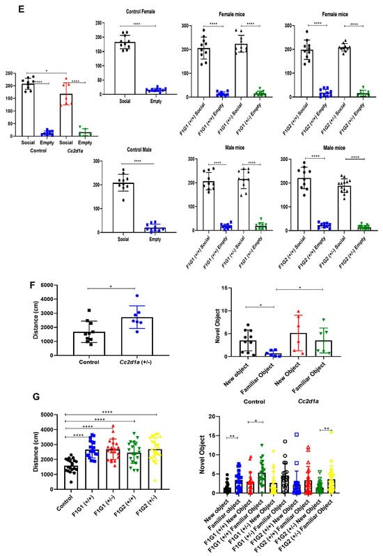 In the novel object test, the distance traveled differed significantly between the control and Cc2d1a groups (p = 0.0163, Figure 1F). The time spent with the novel object and the familiar object also differed. The distance traveled was higher in the G1 and G2 +/+ and +/− genotypes compared to the control and was statistically significant (p < 0.0001, Figure 1G). Differences were also seen between groups according to sex, with female offspring being more active in groups G1 and G2 (Figure 1H,I).