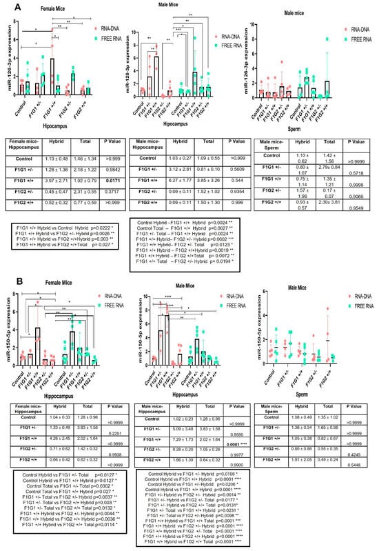 MiR-150-5p expression profiles are shown in Figure 2B. Higher expression of miR-150-5p is observed in female hippocampus in G1 and G2 in the free RNA fraction group, while a decrease is observed in all groups except G2 +/− in the male hippocampus (p < 0.0001). In sperm, there was a decrease in the free RNA fraction of the group compared to the hybrid, with the exception of F1G1 +/− (Figure 2B).