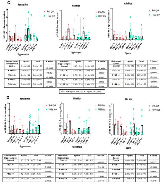 MiR-361-5p expression profiles are shown in Figure 2C. There was a decrease in F1G1 +/+ in the female hippocampus and an increase in all other groups overall. This difference was not significant compared to the hybrid (Figure 2C). In sperm, it increased in F1G1 +/− and F1G2 +/+ (Figure 2C).