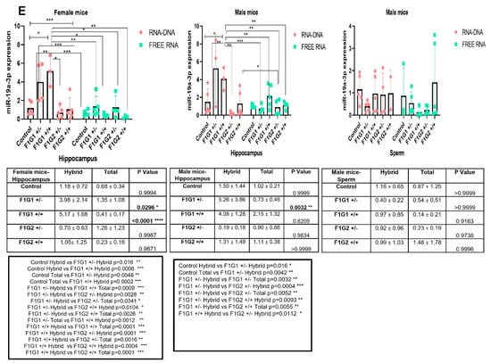 The expression profiles of miR-19a-3p are shown in Figure 2E. In the female hippocampus, there was an increase in the level of miR-19a-3p transcripts in F1G1 +/− and a decrease in all other groups. The decreases observed in the F1G1 +/− and F1G1 +/+ groups were compared to the hybrid RNA fractions and the free fraction, and the result was significant (p = 0.03, p < 0.0001). There was an increase in F1G2 +/− animals in the male hippocampus and a decrease in the fraction of free RNA in all other groups. This difference was not significant compared to the hybrid, with the exception of F1G1 +/− (p = 0.0032). In sperm, it increased in F1G1 +/− and F1G2 +/+, and in other groups there was a decrease (Figure 2E).