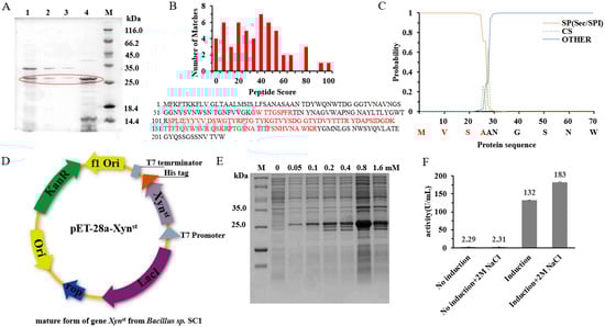 The cloning and identification of a GH11 xylanase from Bacillus sp. SC1: (A) SDS-PAGE of Bacillus sp. SC1 cell free supernatant; (B) LC-MS/MS identification of the secreted xylanase; (C) prediction of the signal peptide and the cleavage site by SignalP; (D) cloning of the mature form of xylanase gene; (E) SDS-PAGE of the xylanase expression in recombinant E. coli BL21/pET-28a-Xyn at different concentrations of IPTG; (F) xylanase activity assay of the cell crude extract of E. coli BL21/pET-28a-Xyn. In (A), the red cycle indicates the protein bands of the potential target enzyme.