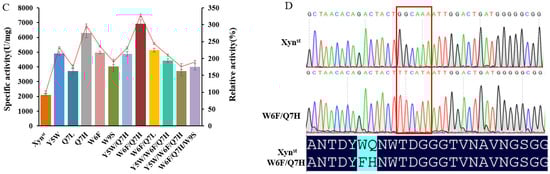 Though the activity of Xynst is higher than many genes cloned from bacteria, it is much lower than a xylanase cloned from Aspergillus niger VTCC 017 [40]. To improve the enzyme performance, we constructed SDM libraries based on rational design. As the active and substrate binding sites are crucial for enzymes, we selected eight amino acids (Y5, W6, Q7, W9, Y65, R49, R112, and W129) as targets for saturation mutation based on protein structure and molecular docking results by Autodock. Facilitated by a newly developed high-throughput screening method, we obtained five positive mutants that possessed improved activity after the screening of 1520 colonies in the SDM library and reaction at 65, 75, and 80 °C, respectively (Figure 2A,B and Figure S4). The increase in the specific activity of these mutants was further confirmed using purified proteins (Figure S5). Among them, two adjacent mutations of W6F and Q7H significantly improve enzyme activity. Combination mutation of them increases activity to 6926 U/mg, which is 3.28-fold that of the wide-type enzyme (Figure 2C). The sequencing of the plasmid validates the mutation of two amino acids as designed (Figure 2D).