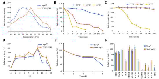 Biochemical characters of Xynst and W6F/Q7H: (A) optimal temperature; (B) thermostability of Xynst; (C) thermostability of W6F/Q7H; (D) optical pH; (E) pH stability; (F) effects of different chemicals on enzyme activity. The optimum temperature was measured in 50 mM Gly-NaOH buffer at different temperatures (30–90 °C), and the highest enzyme activity was normalized as 100%. The thermostability was tested by incubation of enzymes at 55 °C, 60 °C, and 65 °C for 6 h, respectively. The pH stability was measured at pH 9 for 8 h under 55 °C. For all stability assays, enzyme activities at the beginning before incubation were normalized as 100%, respectively. Data represent the mean ± standard deviation of triplicate measurements.