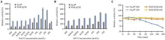 The effects of salts on activity and thermostability of Xynst and W6F/Q7H: (A) effects of NaCl on enzyme activity at different concentrations; (B) effects of KCl on enzyme activity at different concentrations; (C) effects of NaCl on enzyme thermostability. Relative activities were calculated by setting the activity of Xynst as 100% in the absence of salts. For enzyme thermostability assays at 55 °C, activities at the beginning before incubation were normalized as 100%, respectively. Data represent the mean ± standard deviation of triplicate measurements.