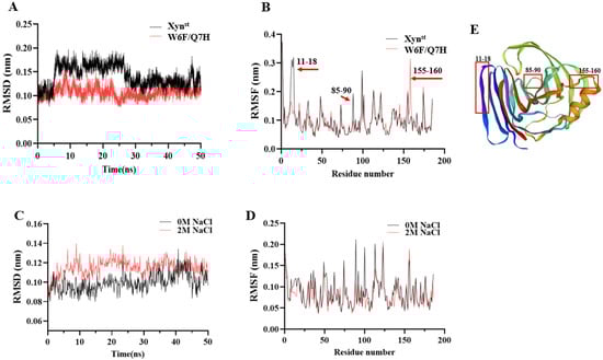 Molecular dynamic simulation of Xynst and W6F/Q7H: (A) the RMSD values of Xynst and W6F/Q7H within the foremost 50 ns; (B) the RMSF values of whole Xynst and W6F/Q7H residues; (C) the RMSD values of Xynst and W6F/Q7H within the foremost 50 ns at 2 M NaCl; (D) the RMSF values of Xynst and W6F/Q7H residues at 2M NaCl; (E) predicted molecular structure of W6F/Q7H. RMSD, root mean square deviation, RMSF, root mean square fluctuation.