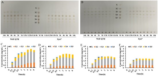 Production of XOS by hydrolysis of xylan using Xynst and W6F/Q7H: (A) TLC analysis of hydrolysate of bagasse xylan after degradation for different hours; (B) TLC analysis of hydrolysate of wheat straw xylan after degradation for different hours; (C) HPLC quantification of different fractions of XOS after degradation of bagasse xylan by W6F/Q7H for different hours; (D) HPLC quantification of different fractions of XOS after degradation of bagasse xylan by Xynst for different hours; (E) HPLC quantification of different fractions of XOS after degradation of wheat straw xylan by W6F/Q7H for different hours; (F) HPLC quantification of different fractions of XOS after degradation of wheat straw xylan by Xynst for different hours. Lane M, xylose and xylooligosaccharides (XOS) standards with different polymerization degrees; X, xylose; X2, xylobiose; X3, xylotriose; X4, xylotetraose; X5, xylopentaose.