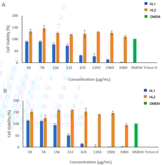 The result of the MTS assay following the incubation of HL1 and HL2 for 24 h is presented in Figure 1A. The application of HL1 for 24 h exhibited that the lowest used concentrations (39 and 78 µg/mL) demonstrated high cellular metabolic activity (≥80%) of HFF-1 cells, as shown in Figure 1A, while increasing the concentration to >313 µg/mL showed a significant reduction in the cellular viability to less than 50%. Conversely, the exposure of HL2 derivative to HFF-1 cells for 24 h exhibited high cell viability at all tested concentrations (5000 to 39 µg/mL), as shown in Figure 1A.