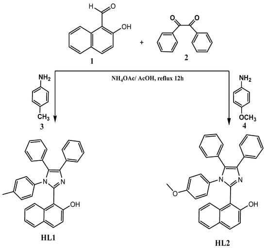 A solution of 2-Hydroxy-1-naphthaldehyde (0.122 g, 1 mmol, benzil (0.231 g, 1.1 mmol), 4-methylaniline (0.492 g, 4 mmol) or 4-methoxyaniline (0.428 g, 4 mmol), and ammonium acetate (0.77 g, 10 mmol) in glacial acetic acid (10 mL) was refluxed under argon for 12 h. After this exposition time, the reaction mixture was cooled and diluted with water (20 mL), and the solid formed was filtered off. The collected precipitate was washed with 10% acetic acid (4 × 5 mL) and water and dried to obtain the pure product of HL1 and HL2 (Scheme 1 and Scheme 2).