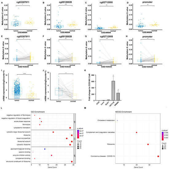 Differential methylation and expression analyses of CYP24A1. Significant CpG sites/promoter between 64 primary tumor tissues and 24 normal tissues in the GSE48684 dataset (A–D) and between 54 primary tumor tissues and 54 matched adjacent normal tissues in the GSE193535 dataset (E–H). CYP24A1 was differentially expressed between unpaired tumor tissues (n = 641) and normal tissues (n = 51) (I), and between paired tumor tissues (n = 50) and adjacent normal tissues (n = 50) (J) in the TCGA tissue cohort with higher expression level in tumor tissues compared to normal tissues. (K) Significant upregulation in expression level of CYP24A1 was observed in both HCT116 and SW480 CRC cell lines compared to the normal human colonic epithelial cell line CCD 841 CoN. Mean ± SEM of N = 3 independent replicates is shown. (L) GO enrichment analysis result (top 5 terms of each subtype) for CYP24A1 and the related genes. (M) KEGG pathway enrichment result for CYP24A1 and the related genes. * p < 0.05, ** p < 0.01, *** p < 0.001, **** p < 0.0001; SEM, standard error of the mean; GEO, Gene Expression Omnibus; TCGA, The Cancer Genome Atlas; CRC, colorectal cancer; MF, molecular function; CC, cellular component; BP, biological process.