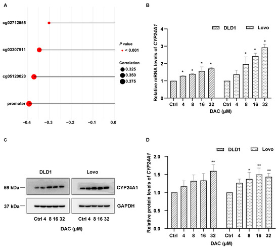 Relationship between DNA methylation and gene expression of CYP24A1. (A) Spearman correlation analysis of DNA methylation of significant CpG sites/promoter and gene expression of CYP24A1 in the TCGA tissue cohort. (B) The changes in mRNA levels of CYP24A1 before and after DAC treatment at various concentrations in DLD1 and Lovo CRC cell lines. Mean ± SEM of N = 3 independent replicates is shown. (C,D) The changes in protein levels of CYP24A1 before and after DAC treatment at various concentrations in DLD1 and Lovo CRC cell lines. Mean ± SEM of N = 3 independent replicates is shown. * p < 0.05, ** p < 0.01; DAC, 5-aza-2′-deoxycytidine; SEM, standard error of the mean; TCGA, The Cancer Genome Atlas; CRC, colorectal cancer.