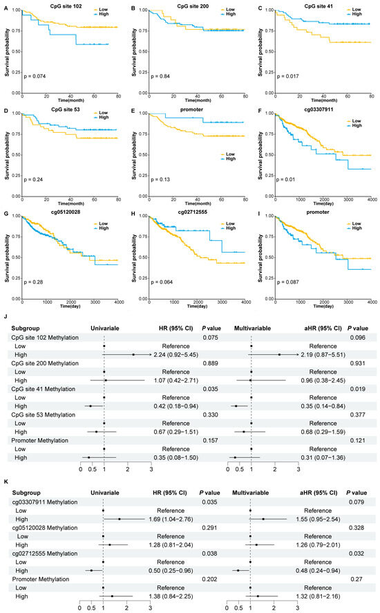 Kaplan–Meier survival curves indicated that patients with higher methylation levels of CpG site 41 had significantly better survival (p < 0.05) (Figure 3C). Similarly, patients with higher methylation levels of cg02712555 exhibited better survival, though not statistically significant (Figure 3H). In contrast, patients with higher methylation levels of cg03307911 had significantly poorer survival (p < 0.05) (Figure 3F). No significant differences were observed between the two groups for other CpG sites or the promoter in both the blood cohort (Figure 3A,B,D,E) and TCGA tissue cohort (Figure 3G,I).