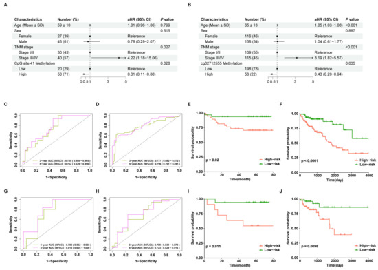 Figure 4A,B illustrates multivariable Cox regression models constructed based on age, sex, TNM stage, and the methylation level of CpG site 41 in the training set of the blood cohort, and based on age, sex, TNM stage, and the methylation level of cg02712555 in the training set of the TCGA tissue cohort, with sample sizes of 70 and 254, respectively. Time-dependent ROC curves (Figure 4C,D,G,H) demonstrated the predictive performance of the prognostic risk scores. In the blood cohort, the AUC values for predicting the 3- and 5-year survival of CRC patients were 0.735 (95%CI, 0.605–0.865) and 0.762 (95%CI, 0.629–0.896) in the training set and 0.750 (95%CI: 0.562–0.938) and 0.812 (95%CI: 0.625–1.000) in the test set, respectively. Similarly, in the TCGA tissue cohort, the AUC values for predicting 3- and 5-year survival were 0.777 (95%CI: 0.682–0.872) and 0.796 (95%CI: 0.701–0.891) in the training set and 0.709 (95%CI: 0.539–0.878) and 0.723 (95%CI: 0.529–0.916) in the test set, respectively.