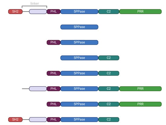 SHIP1 Domain Constructs [Created in BioRender. Müller, S. (2024) https://BioRender.com/r91z694, (accessed on 1 November 2024)]. The domain lengths in this figure are scaled to match the lengths of the corresponding amino acid sequence. From top to bottom: SHIP1 FL, 5PPase, PHL-5PPase, 5PPase-C2, PHL-5PPase-C2, linker-PHL-5PPase-C2-PRR (ΔSH2), PHL-5PPase-C2-PRR (ΔSH2-linker), SH2-linker-PHL-5PPase-C2 (ΔPRR).