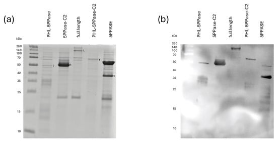 SDS-PAGE and Western blot (a,c) show the Coomassie-stained SDS-PAGE gel, and (b,d) the Western blot results with the Strep-MAB Classic HRP conjugate antibody, according to Section 2.2, after the expression and purification of Strep-tagged SHIP1 domain constructs. Target bands were marked with a t to the right of the band. The following constructs are shown from left to right: (a,b) PHL-5PPase; 5PPase-C2; FL; PHL-5PPase-C2; 5PPase; (c,d) FL; linker-PHL-5PPase-C2-PRR (ΔSH2); PHL-5PPase-C2-PRR (ΔSH2-linker); SH2-Linker-PHL-5PPase-C2 (ΔPRR).
