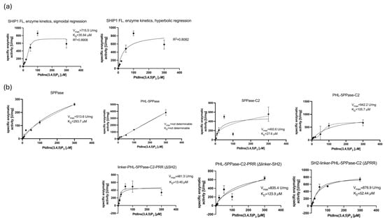 Curves of the Michaelis–Menten Equation. (a) Determination of the enzyme kinetics of SHIP1 FL towards PtdIns(3,4,5)P3. The specific activity of SHIP1 FL was determined for substrate concentrations ranging from 0 to 300 µM, plotted against the substrate concentration in µM and analyzed by hyperbolic or sigmoidal regression to determine the Vmax and Km. Error bars indicate standard deviations. n = 3. (b) Determination of the enzyme kinetics of SHIP1 5PPase, SHIP1 PHL-5PPase, SHIP1 5PPase-C2, SHIP1 PHL-5PPase-C2, SHIP1 linker-PHL-5PPase-C2-PRR (ΔSH2), SHIP1 PHL-5PPase-C2-PRR (ΔSH2-linker), and SHIP1 SH2-linker-PHL-5PPase-C2 (ΔPRR) domain constructs towards PtdIns(3,4,5)P3. The specific activity of the constructs was determined for substrate concentrations ranging from 0 to 300 µM, plotted against the substrate concentration in µM and analyzed by hyperbolic or sigmoidal regression to determine the Vmax and Km. Error bars indicate standard deviations. n =3.