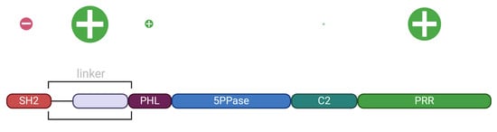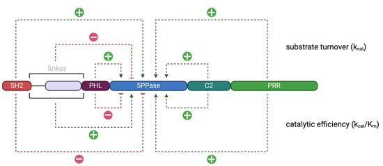 Model of the SHIP1 Domains and Their Impact on Allosteric Regulation of the Catalytic Activity [Created in BioRender. Müller, S. (2024) https://BioRender.com/q81p221, (accessed on 1 November 2024)]. The plus and minus signs represent the change in ΔR2 = R2sig − R2hyp, which is the difference in coefficient of determination (R2) for the sigmoidal regression (sig) and the hyperbolic regression (hyp), when the corresponding domain is added to a SHIP1 construct. A plus sign represents an increase in the adherence to the sigmoidal regression compared to the hyperbolic regression. The plus and minus signs are scaled to the magnitude of the effect. SH2 − 2.075%; linker + 6.04%; PHL + 1.44%; C2 + 0.36%; PRR + 5.445%.