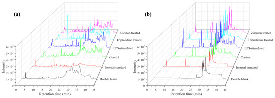 Figure 1. The representative total ion chromatograms (TICs) of the double blank, internal standard solution (2 µg/mL), and the cell samples of the untreated control, LPS-stimulated, triprolidine-treated LPS-stimulated, and zileuton-treated LPS-stimulated groups. (a) Positive ionization mode and (b) negative ionization mode.