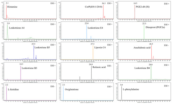 Figure 2. The representative extracted ion chromatograms (EICs) of some identified metabolites in either positive or negative ESI acquisition mode and the internal standard (2 µg/mL) in the LPS-stimulated mast cell samples.