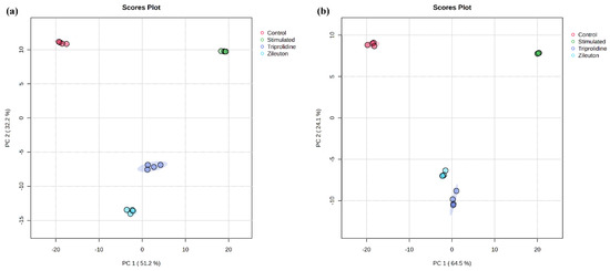 Principal component analysis (PCA) and pathway enrichment analysis were performed on the MetaboAnalyst 6.0 (available at https://www.metaboanalyst.ca/MetaboAnalyst/, accessed on 28 May 2024). In detail, the (.csv) files of sample replicates (i.e., two biological and two technical replicates) of each group from the same polarity (positive) were exported from Agilent MassHunter Profinder containing data like mass, retention time, and peak area. Replicate measurements’ (.csv) files were grouped together in a single folder for each condition (for, e.g., replicate files of control data into the control group folder). All the experimental condition groups, control, LPS-stimulated, and two distinct positive controls (triprolidine and zileuton), were merged into one (.zip) folder and uploaded to MetaboAnalyst. The mass tolerance of 0.025 Da and retention time tolerance of 30.0 s were set for processing the MS peak list data. The data were normalized using the IS reference feature (i.e., mass, retention time, and peak area), and data filtering was performed based on an “interquartile range” (IQR) of 5% to remove variables and increase the accuracy. The data were log-transformed (base 10) and auto-scaled. The processed data were then used to plot the 2D PCA plot. Similar steps were performed for negative polarity to plot another 2D PCA plot.