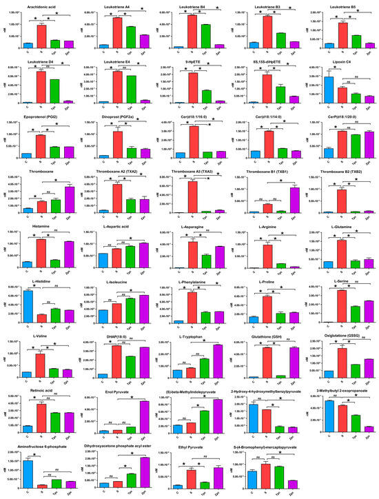 In the LPS-stimulated group, 39 of the 44 metabolites were upregulated compared to the control group. The exceptions were aminofructose 6-phosphate, l-histidine, 2-hydroxy-4-hydroxymethylbenzalpyruvate, lipoxin C4, and 3-methylbutyl 2-oxopropanoate, which were downregulated. Compared to the LPS-stimulated group, the triprolidine-treated group showed downregulation in 35 of the 44 metabolites. However, aminofructose 6-phosphate, l-aspartic acid, (S)-beta-methylindolepyruvate, dihydroxyacetone phosphate acyl ester, enol pyruvate, l-histidine, l-isoleucine, thromboxane, and l-tryptophan were upregulated. Similarly, 31 of the 44 metabolites were downregulated in the zileuton-treated group compared to the LPS-stimulated group. Two metabolites, CerP(d18:1/20:0) and glutathione, remained unchanged, while aminofructose 6-phosphate, l-aspartic acid, (S)-beta-methylindolepyruvate, dihydroxyacetone phosphate acyl ester, enol pyruvate, ethyl pyruvate, l-histidine, l-isoleucine, thromboxane, thromboxane B1, and l-tryptophan, were upregulated.