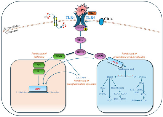 Figure 6. Activation of MyD88 (myeloid differentiation)-dependent pathways by binding LPS (lipopolysaccharide) to TLR4 (Toll-like receptor 4). Other abbreviations: Ca2+: calcium ion; IRAK: interleukin-1 receptor-associated kinase; TRAF6: TNF receptor-associated factor 6; MAPK: mitogen-activated protein kinase; NFκB: nuclear factor κB; AP1: activator protein 1; SP1: specificity protein 1; HDC: histidine decarboxylase; cPLA2: cyclic phospholipase A2; COX-2: cyclooxygenase-2; ALOX5: arachidonate 5-lipoxygenase; ILs: interleukins; TNFα: tumor necrosis factor α; MD-2: myeloid differentiation factor 2; CD14: cluster of differentiation 14.