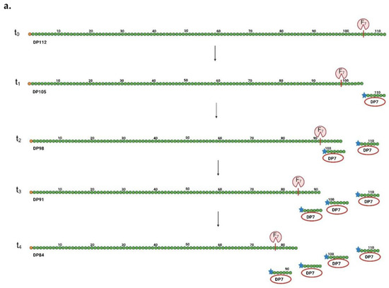 - Ambiguous classification because of technical limitations and differential interpretations: To better illustrate the confusion between endo- and exo-type enzyme products, we refer to two publications that report on DP7 and DP8 LOSs [24,26]. Some authors refer to these enzymes as endo-acting [28], while others categorize them as exo-acting [29]. A closer inspection of the data of [24] shows that Thin-Layer Chromatography (TLC) data were not shown, while their High-Pressure Liquid Chromatography (HPLC) analysis [24] showed a putative “DP7 peak”.
