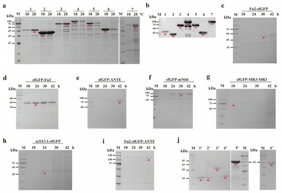 Analysis of nanobodies and sfGFP nanobody. (a) SDS-PAGE analysis of the outer membrane cell fraction. Lane 1: outer membrane fraction of Fu2-sfGFP after induction at 18 °C and 28 °C; lane 2: outer membrane fraction of sfGFP-Fu2 after induction at 18 °C and 28 °C; lane 3: outer membrane fraction of sfGFP-ANTE after induction at 18 °C and 28 °C; lane 4: outer membrane fraction of sfGFP-mNb6 after induction at 18 °C and 28 °C; lane 5: outer membrane fraction of sfGFP-MR3-MR3 after induction at 18 °C and 28 °C; lane 6: outer membrane fraction of n3113.1-sfGFP after induction at 18 °C and 28 °C; lane 7: outer membrane fraction of Fu2-sfGFP-ANTE after induction at 18 °C and 28 °C. (b) Western blotting for purified nanobodies. Lane 1, 2, 3, 4, 5, 6, and 7 correspond to Fu2-sfGFP, sfGFP-Fu2, sfGFP-ANTE, sfGFP-mNb6, sfGFP-MR3-MR3, n3113.1-sfGFP, and Fu2-sfGFP-ANTE. (c–i) SDS-PAGE analysis of the culture medium for the corresponding strains at different times (18, 24, 30, and 42 h). c, d, e, f, g, h and i correspond to E-Fu2-sfGFP, E-sfGFP-Fu2, E-sfGFP-ANTE, E-sfGFP-mNb6, E-sfGFP-MR3-MR3, E-n3113.1-sfGFP, and E-Fu2-sfGFP-ANTE. respectively. (j) SDS-PAGE analysis of the nanobodies without sfGFP. Lane 1’: Fu2: HRV 3C protease was used to remove the sfGFP tag from Fu2-sfGFP; lane 2’: Fu2: HRV 3C protease was used to remove the sfGFP tag from sfGFP-Fu2; lane 3’: MR3-MR3: SUMO protease was used to remove the sfGFP tag from sfGFP-MR3-MR3; lane 4’: n3113.1: HRV 3C protease was used to remove the sfGFP tag from n3113.1-sfGFP; lane 5’: ANTE: HRV 3C protease was used to remove the sfGFP tag from sfGFP-ANTE; lane 6’: mNb6: SUMO protease was used to remove the sfGFP tag from sfGFP-mNb6. M: Marker.