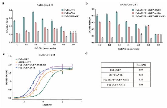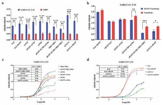The affinity of the nanobodies was evaluated using indirect ELISA. All of the recombinant nanobodies generated high absorbance values at 450 nm (Figure 3a), and the IC50 of nanobodies was lower than 3 nM, except the n3113.1, demonstrating that the recombinant nanobodies had high affinity against SARS-CoV-2 S1 (Figure 3c,d). Additionally, we compared the affinity of the nanobodies with and without the sfGFP tag. For Fu2, mNb6, and ANTE, the sfGFP fusion nanobodies showed comparable affinity with the monomer nanobodies, while MR3-MR3 and n3113.1 showed higher affinity when sfGFP was removed from the recombinant nanobodies (Figure 3b–d).
