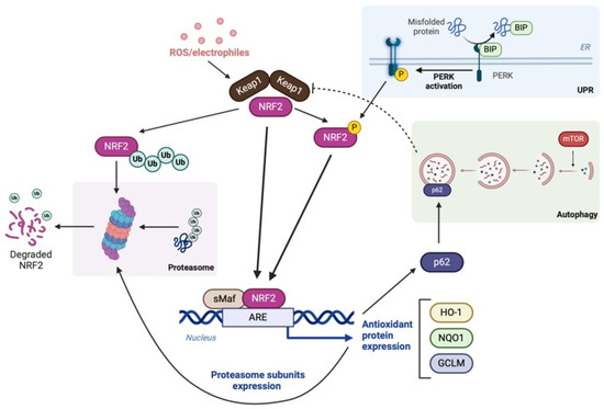 Schematic overview of the NRF2 interaction mechanisms with the unfold protein response (UPR), the mTOR/autophagy pathways and the ubiquitin-proteasome system (UPS). See details in the text (created with BioRender, Toronto, ON, Canada).