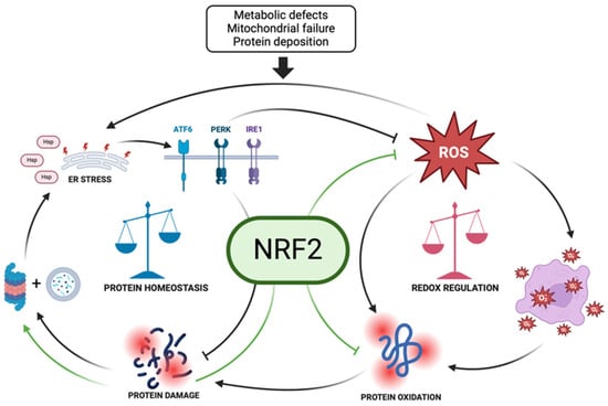 Schematic overview of the central role of NRF2 in regulating protein homeostasis and redox balance. Green lines describe the interventions of NRF2 in homeostatic mechanisms (created with BioRender, Toronto, ON, Canada).