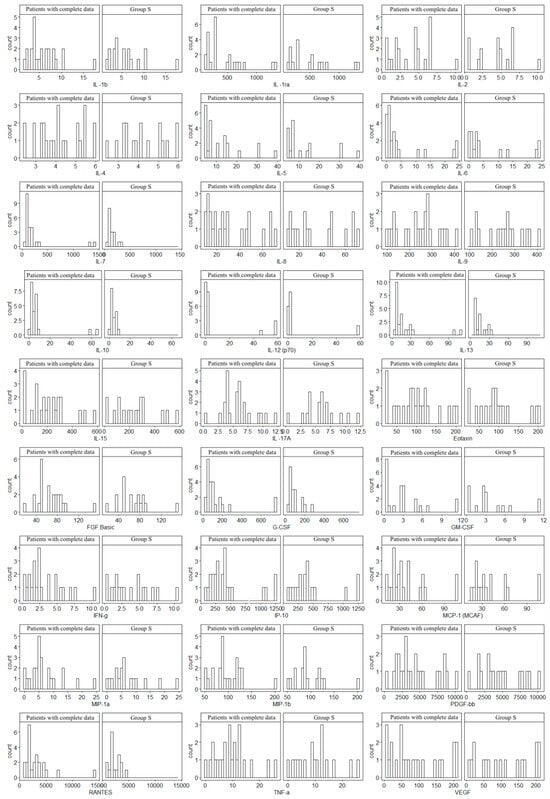 Since not all patients underwent MRE, the histogram analysis was used to assess the consistency of the obtained data (17 patients were examined in relation to the entire Group S). In all cases, similar distributions of cytokine concentrations were observed, which supports the homogeneity of the groups. Histograms are given in Figure 1.