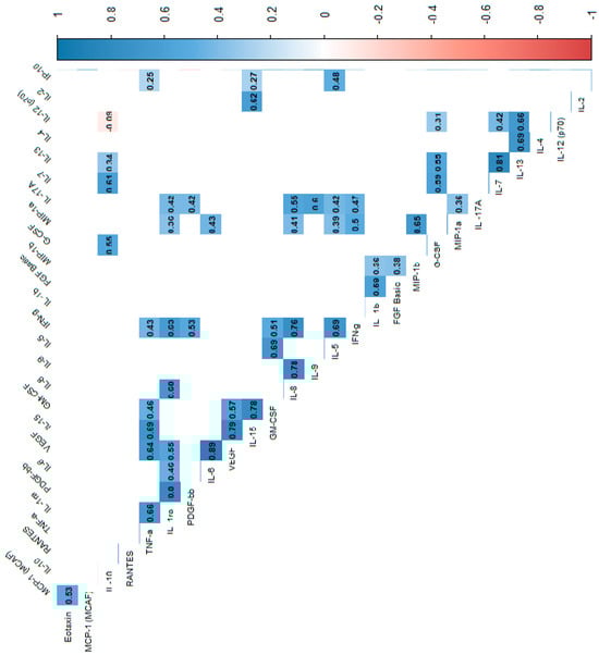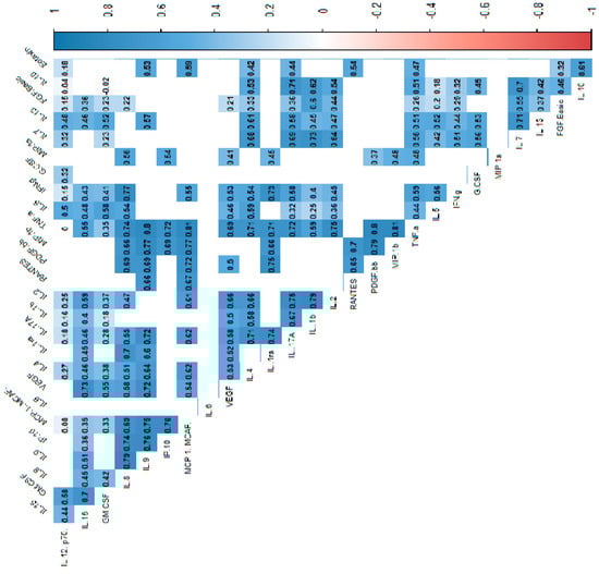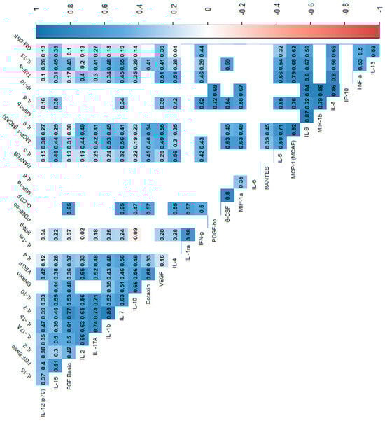 Correlation values of the cytokines and IL-1RA in the control group. The data are presented as a heat map with hierarchical grouping. The figure shows only statistically significant correlations at p < 0.05. The numbers inside the fields represent Spearman’s correlation coefficients.