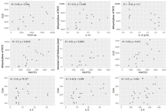 Next, we performed the analysis of the correlations between the values of CDAI and the cytokines and radiological parameters. Significant correlations were found between the CDAI values and the levels of IL5, IL-8 and IL-9. Other cytokines and all radiological parameters did not correlate significantly with the CDAI. Significant correlations are shown in Figure 5.