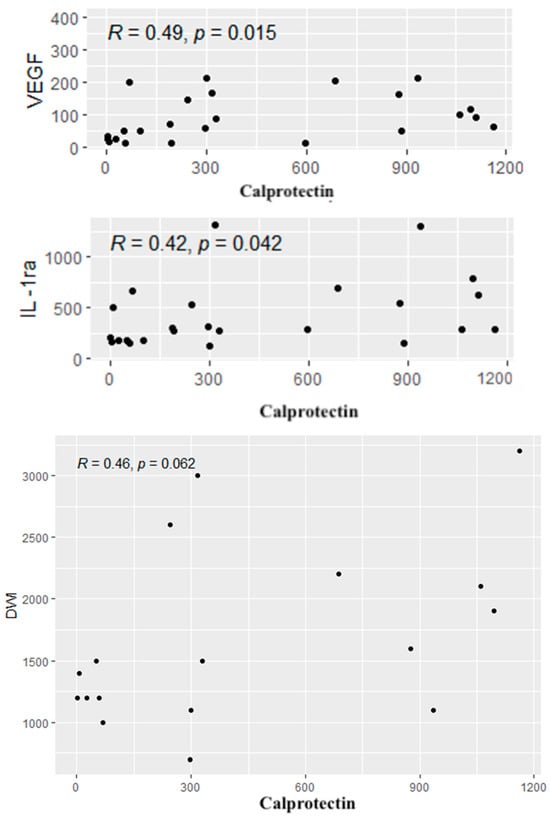 A similar analysis was performed between calprotectin concentrations and the cytokines, CDAI values and radiological parameters. Positive correlations were found between calprotectin concentrations and the levels of IL-1RA and VEGF. In addition, a tendency to a positive correlation was observed between the level of calprotectin and the diffusion restriction on DWI (p = 0.06). Significant correlations are given in Figure 6.