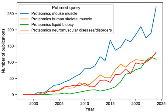 Skeletal muscle constitutes 40% of the human body mass and plays vital roles in locomotion and whole-body metabolism. As a major regulatory tissue of whole-body metabolism, skeletal muscle is composed of a diverse mixture of muscle fiber types: type I (slow oxidative), type IIa (fast oxidative), and type IIx (fast glycolytic) [1]. Aging and several (hereditary) diseases differentially affect the various fiber types, and therefore, investigating the changes in the proteome in a fiber-type-specific manner is essential [2]. Over the last decades, protein analytics represented an important aspect in the diagnostic workup of patients clinically presenting with muscular diseases, for which more than 200 different genetic subtypes have been described [3]. For that purpose, immunoblot studies on protein extracts of muscle biopsies were carried out in addition to immunostaining studies and histological studies on muscle biopsy specimens. Although this analytical approach enabled us to obtain hints toward underlying genetic defects, only small panels of proteins could be examined at once. This, in turn, represents a considerable limitation given the growing list of genes and auto-immune defects linked to the manifestation of muscular disease and might even result in a diagnostic odyssey for patients, challenging proper genetic counseling [3]. Not only does the amount of material required for a very comprehensive biochemical profiling of skeletal muscle biopsies pose a limitation, especially in the field of neuropediatrics, but also the availability of suitable antibodies along with the time and costs associated. In light of these facts, it is obvious that alternative analytical approaches such as proteomics may provide the potential to overcome these limitations by enabling the high-throughput study of thousands of proteins in a single experiment while requiring a minimal amount of material. Accordingly, proteomic-based analysis of proteins has made enormous inroads into the research of muscle diseases, especially in the past decade. This was essentially aimed at improving the understanding of underlying pathophysiologies, which is an important prerequisite to the identification of starting points for therapeutic intervention concepts. The investigation of many of the individual entities of muscle diseases was based on the use of biomaterial from either animal models (e.g., mouse models and zebrafish) patients, or both. These aspects are mirrored by the increase of respective publications listed in Pubmed as visualized in Figure 1. Studies on animal models also allowed us to determine the proteomic signature of different muscle fiber types that are present in the complex muscle tissue. For instance, an in-depth study on laser-microdissected mouse muscle fibers immunolabeled for Myosin heavy chain isoform investigated by mass spectrometry revealed unique fiber type protein profiles, confirming fiber-type-specific metabolic properties and indicating a more versatile function of type IIx fibers. Of note, the same study highlighted that multiple myopathy-associated proteins were enriched in type I and IIa fibers [4]. A comparative proteomic and transcriptomic study published recently enabled the molecular dissection of skeletal muscle in infants and adults thus enabling biochemical insights into healthy muscle aging [5].