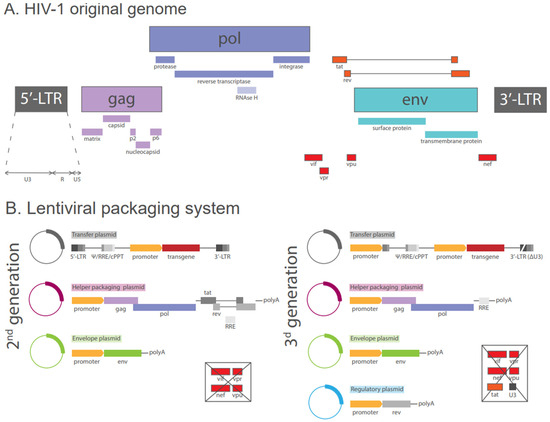 - Cockrell, A.S.; Kafri, T. Gene delivery by lentivirus vectors. Mol. Biotechnol. 2007, 36, 184–204. [Google Scholar] [CrossRef]