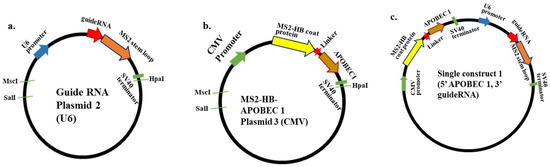 For the preparation of a single construct 1 (single construct 1), the entire APOBEC 1 deaminase coding sequence, along with that of the MS2-HB coat protein, under the control of the pol II CMV promoter and followed by an SV-40 terminator, were inserted into a vector construct containing guide RNA under the control of the pol III U6 promoter. The CMV-MS2HB-APOBEC1-SV40 terminator region was excised from the APOBEC1 construct using the NdeI and HpaI restriction enzymes. After digestion, both the vector and the insert ends were blunted using a Klenow fragment kit (Takara). The blunt-ended vector and insert were then ligated; the direction of the ligated fragments was not important, as each part had their own individual promoter and terminator sequences. The final construct was: