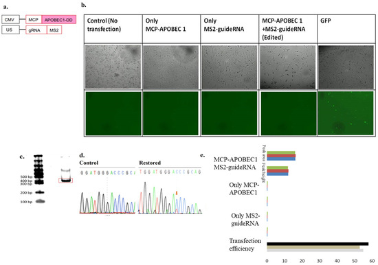 Subsequently, we introduced the 1× MS2 guide RNA (double MS2-guide RNA) along with the MCP-APOEBC1 deaminase and determined the editing rate, which was 36.66% and 34%, according to peak area and peak height, respectively. These results are supported by findings reported by Katrekar et al. (2019) [