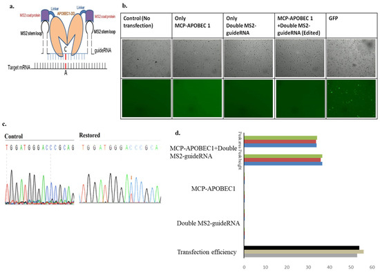 44]. While co-transfection of two distinct factors (deaminase and guide RNA) is conducted on the cells, it may cause the cells to be more stressed, and it is also possible that the uniform release of both the factors will not occur (disbalance of ratio between the factors), which means the deaminase may be released but not the same amount or at the same time as the guide RNA, which will undoubtedly have an adverse impact on editing (reduced). As a result, we preferred to incorporate both the editing factors (APOBEC1-MS2 coat protein and guide RNA-MS2-stem-loop) into one single plasmid vector to make transfection easier and less stressful for the cells and also to ensure the proper release (uniformity) of the editing factors. There are several other techniques that are used for C-to-U editing, most of which are derivatives of CRISPR, such as CURE (dCas13X and APOBEC3), RESCUE, or RESCUE-S (dCas13X and mutated ADAR). But for CRISPR, we believe that the gene size requirement is large, which may be a disadvantage because of its immune response. This is a drawback for such systems when using vectal vectors to introduce genes in the future, and the immune response may limit its effectiveness. However, CRISPR can be conducted with nucleic acid strand breaks like Cas or with deaminases instead of Cas. But, with cleavage, the risk of off-target editing is higher.
