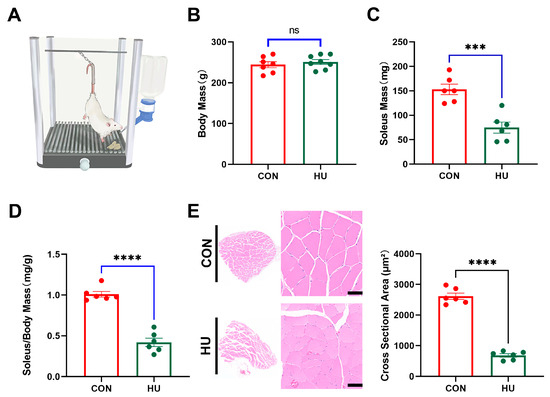Analysis of soleus muscle atrophy induced by hindlimb unloading (n = 6). (A) the model of hindlimb unloading in rats. (B) Body mass collected in the CON group (CON) and hindlimb unloading (HU). (C) Wet soleus mass and Soleus/Body Mass (D). (E) Myofibre cross-sectional area (CSA) of soleus. (Scale Bar = 50 µm. The data represent the mean ± SEM, n = 3; ns stands no statistical significance, *** p < 0.001, **** p < 0.0001).