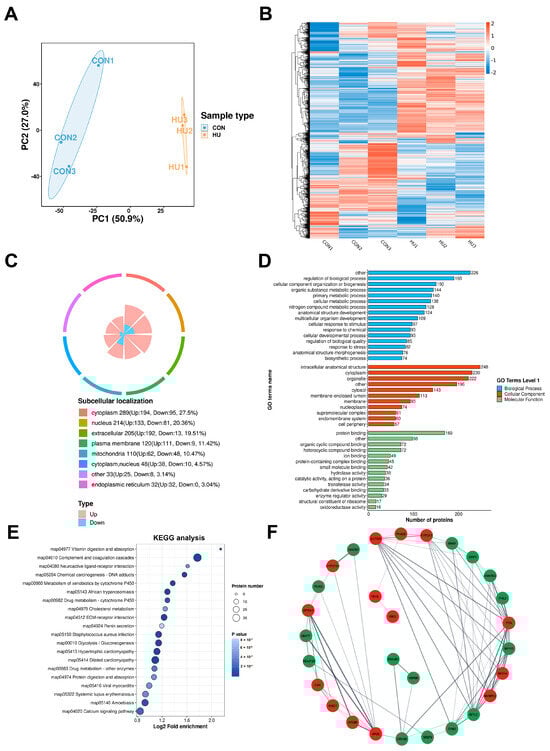 Proteomic analyses of the HU group and the CON group (n = 3). (A) PCA analysis of HU and CON groups. The horizontal and vertical axes show the degree of interpretation of PC1 and PC2, with higher values increasing the degree of interpretation. The degree of aggregation within groups represents the repeatability of the grouped samples, and the repeated samples in each group tend to be clustered together. (B) Heatmap of hierarchical clustering analysis for all groups. The horizontal coordinate represents the grouping of different samples. Red indicates the high expression of the substance, and blue indicates the low expression of the substance. (C) Pie plot showing the different classifications of DMPs. Different color blocks indicate different taxonomic categories, and percentages indicate the proportion of proteins belonging to that type among all identified proteins percentage of the number. (D) GO classification shows the DEPs classification. The horizontal axis represents the number of differentially expressed proteins in the classification, and the vertical axis represents the secondary functional classification in the primary classification of GO (Biological process/Cellular component/Molecular function). The figure shows the first-order classification of GO in different colors. (E) KEGG analysis of DEPs. The dotplot shows the 20 most significantly enriched functions. The vertical axis represents the KEGG function description information, while the horizontal axis represents the enrichment significance p-value of the-Log10 transformation; the higher the value, the stronger the enrichment significance. (F) Protein–protein interaction (PPI) network of DEGs between HU and CON based on the STRING database. Red nodes indicate upregulated proteins, and green nodes represent downregulated proteins.