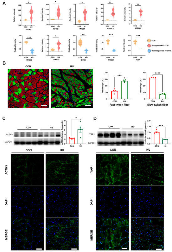 Effect of hindlimb unlaoding on muscle fiber type. (A) Violin plots showing DEPs related to myofiber type. (B) The immunofluorescence assays of fast-twitch fibers (green) and slow-twitch muscle fiber types (red). (C,D) Western blot and Immunofluorescent staining with target ACTN3 and YAP1. (Scale Bar = 50 µm. The data represent the mean ± SEM, n = 4; * p < 0.05, ** p < 0.01, *** p < 0.001, **** p < 0.0001).Western blot original images can be found in Figure S5.