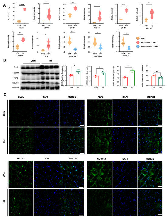 In addition to muscle contraction-related structural proteins, it is worth noting that several proteins involved in metabolic processes were dysregulated in the unloaded soleus of rats. The expression of GLUL, the only enzyme capable of synthesizing glutamine, increased after hindlimb unloading. According to our proteomics analysis, the glutathione transferase family members A3, P1, T3, M1, M3, and M4 (GSTA3, GSTP1, GSTT3, GSTM1, GSTM3, and GSTM4), which are located in the cytoplasm of both cardiac and skeletal muscles [22], were upregulated. FBP2 is a muscle-specific form of fructose bisphosphatase that converts fructose-1,6-bisphosphate to fructose-6-phosphate in mammalian muscle and is abundant in fast-twitch muscle tissues. Similar to previous findings in mice [23], the expression of FBP2 increased in response to gravity unloading in the soleus muscle of rats. NDUFS4 plays a crucial role in mitochondrial energy metabolism and is also downregulated after hindlimb unloading. Additionally, the protein expression of several other NADH dehydrogenases, including NADH:ubiquinone oxidoreductase subunit S6-like 1(NDUFS6L1) and NADH:ubiquinone Oxidoreductase Subunit A7(NDUFA7), was also decreased after hindlimb unloading (Figure 4A). Consistent with our data from proteomics analysis, western blot results indicated that the expression of ACTN3, GLUL, GSTM4, and FBP2 was upregulated, and the protein levels of NDUFS4 were decreased in unloading muscles (Figure 4B). The expression of GLUL, GSTM4, FBP2, and NDUFS4 was also verified by immunofluorescence (Figure 4C). Based on these changes in representative proteins, we can gain a better understanding of disuse muscle atrophy induced by hindlimb unloading.