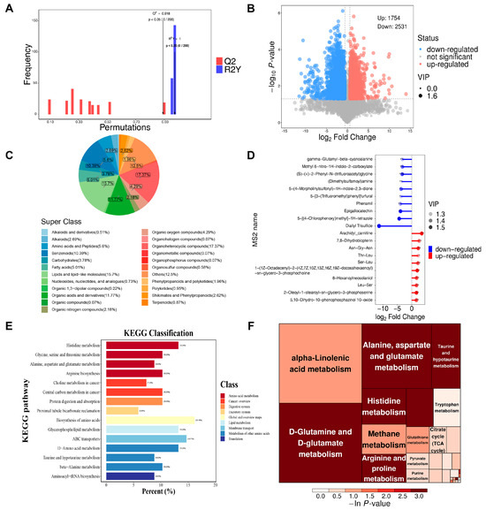 Metabolomic analysis of the HU group and the CON group (n = 3). (A) OPLS-DA model permutation plots for HU and CON groups showing a high explanatory and predictive power for categorical variables. (B) Volcano plots showing differential metabolites with the screening criteria including p < 0.05, VIP> 1, and FC > 1.5 or FC < 0.67. The red and blue dots represent metabolites that increased and decreased significantly in the HU group, respectively. (C) Pie plot showing the different classifications of DAMs. Different color blocks indicate different taxonomic categories, and percentages indicate the proportion of metabolites belonging to that type among all identified metabolites percentage of the number. (D) Matchstick analysis for DAMs between the CON and HU groups showing the top 10 upregulated and downregulated metabolites in terms of fold changes. The horizontal axis of the graph shows the logarithmically transformed fold changes, and the color intensity of the points represents the VIP values. (E) KEGG Classification of DAMs. The abscissa represents the percentage of the number of annotated differential metabolites under a certain pathway to the number of all annotated differential metabolites, and the ordinate represents the enriched KEGG metabolic pathway name. (F) Metabolic pathway analysis using MetaboAnalyst. In the tree map, each square represents a metabolic pathway. The size of the square indicates the impact factor of the pathway in the topological analysis. The larger the size, the greater the impact factor. The color of the square indicates the p-value of the enrichment analysis. The darker the color, the smaller the p-value and the more significant the enrichment.