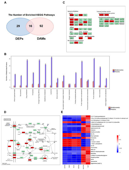 Integrated analyses of Proteomics and Metabolomics. (n = 3) (A) Venn diagrams showing the number of protein (blue) and metabolite (red) pathways significantly changed after hindlimb unloading, followed by a list of pathways that were regulated at both the protein and metabolite levels. (B) Barplot of KEGG pathway enrichment. (C,D) The KEGG pathway maps of lysosomes (C) and ferroptosis (D). (Blue indicates downregulation and red indicates upregulation. The small disc represents metabolites. The rectangle represents proteins.) (E) Heat map of correlation between DEPs ACTN3, FBP2, GLUL, GSTM4, NDUFS4, YAP1, and metabolites. (* p < 0.05, ** p < 0.01).