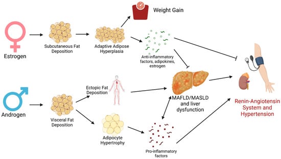 The liver is another organ that warrants investigation in the context of hypertension. The liver is one of the most important organs in fat metabolism, as it is a major source of de novo lipogenesis and lipoprotein regulation. Results from high-fat feeding studies in rodents consistently show that males develop liver fat accumulation, while females develop more severe obesity [83,84]. These results suggest that female adipose tissue has superior adaptability to chronic increased fat availability, as subcutaneous adipose is more likely to undergo hyperplasia, while visceral fat more readily undergoes pathologic hypertrophy. Furthermore, visceral, but not subcutaneous, fat is known to increase sympathetic activation, induce renal disease, and increase plasma leptin levels [71,85,86]. When the storage capacity of adipose tissue is exceeded, fat can begin accumulating in other organs, including the liver, and in circulation. The increased fat in male livers, which can range from metabolic dysfunction-associated fatty liver disease (MAFLD) to metabolic dysfunction-associated steatotic liver disease (MASLD) to cirrhosis, leads to an increased inflammatory state in the liver. Furthermore, fatty livers were detected in ~30% of patients who were hypertensive without any other risk factors for metabolic syndromes (including obesity), which is higher than the prevalence of MAFLD in the general population [87].